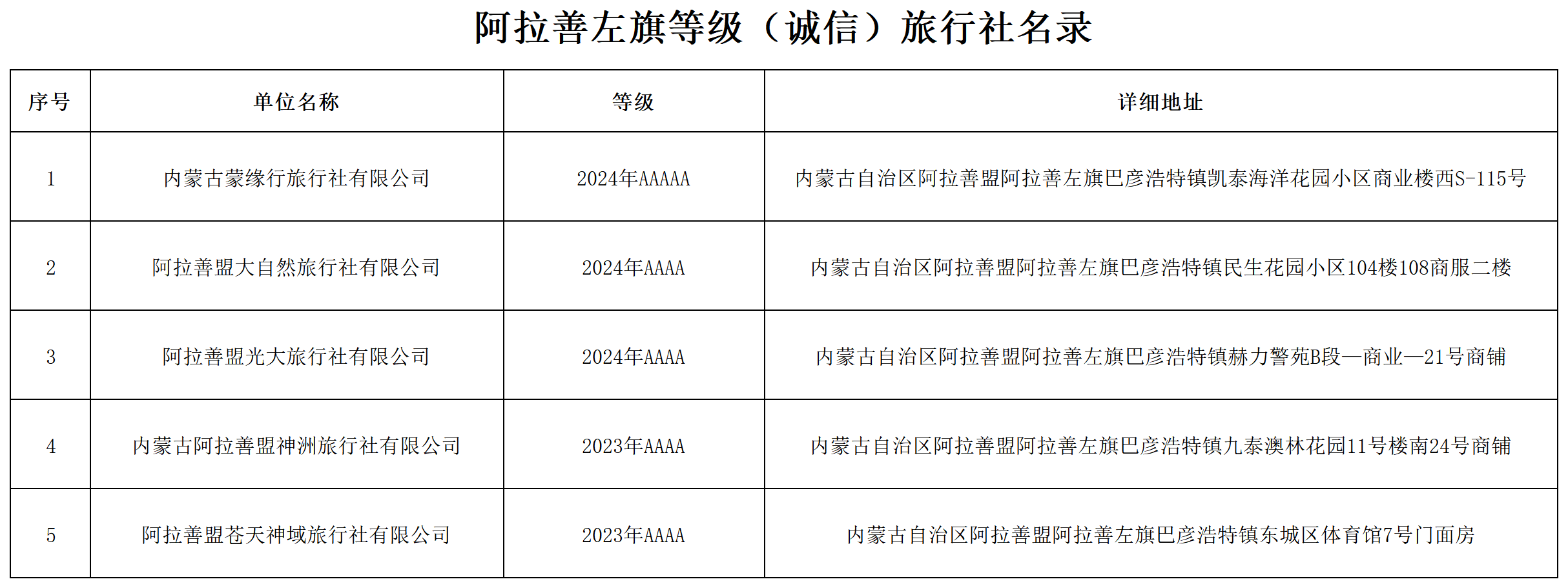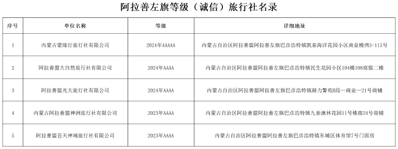 阿拉善左旗等級(誠信)旅行社名錄
