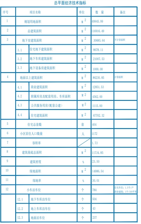 原審批規劃指標:規劃用地面積49945.99平方米,總建筑面積124700.33平方米,地下室建筑面積35727.79平方米,地面以上建筑面積88972.54平方米,容積率1.78,建筑基底總面積12099.04平方米,建筑密度24.22%,綠地面積14986.54平方米,綠地率30.01%,小車泊車位784個。其中住宅用地總平面經濟技術指標規劃用地面積46496.92平方米,總建筑面積111848.8平方米,地下室建筑面積35727.79平方米,地面以上建筑面積76121.01平方米,建筑基底總面積10147.93平方米;商業用地總平面經濟技術指標規劃用地面積3449.07平方米,總建筑面積12851.53平方米,建筑基底總面積1951.11平方米。