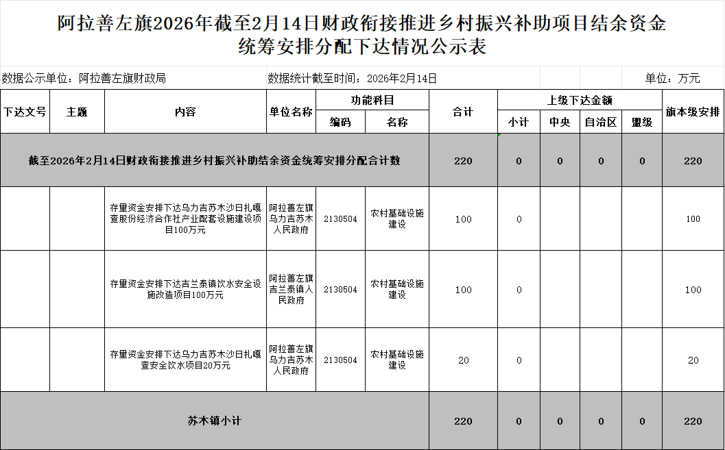 阿拉善左旗財(cái)政局關(guān)于2026年截至2月14日財(cái)政銜接推進(jìn)鄉(xiāng)村振興補(bǔ)助項(xiàng)目結(jié)余資金統(tǒng)籌安排使用投入情況的公告公示